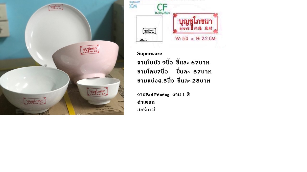- ภาชนะ เมลามีน จาน ชาม พิมพ์โลโก้ งานสั่งผลิต งานฟอยล์ จานชามพิมพ์ชื่อ จานชามพิมพ์โลโก้ งานสั่งผลิตตามแบบลูกค้า
